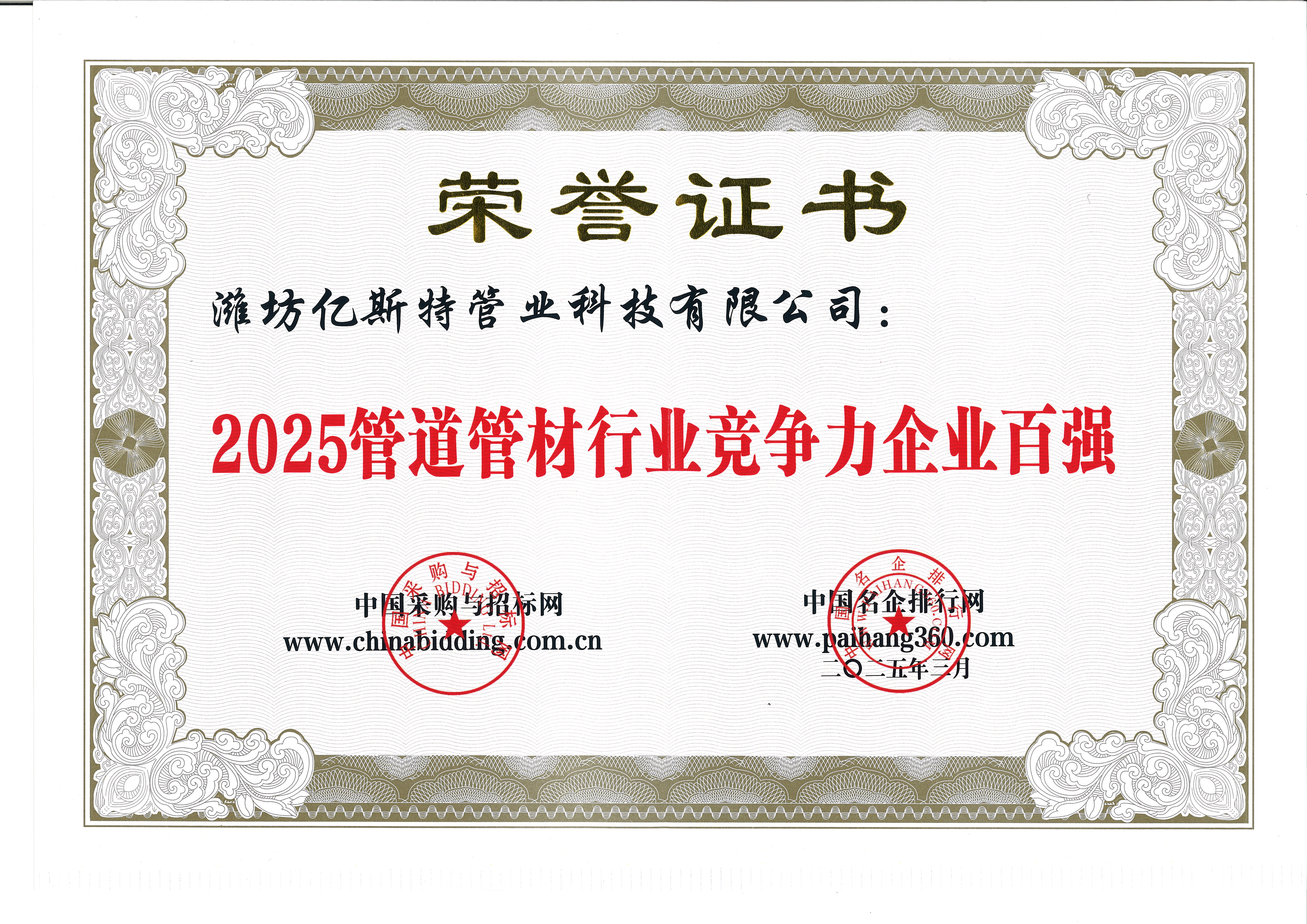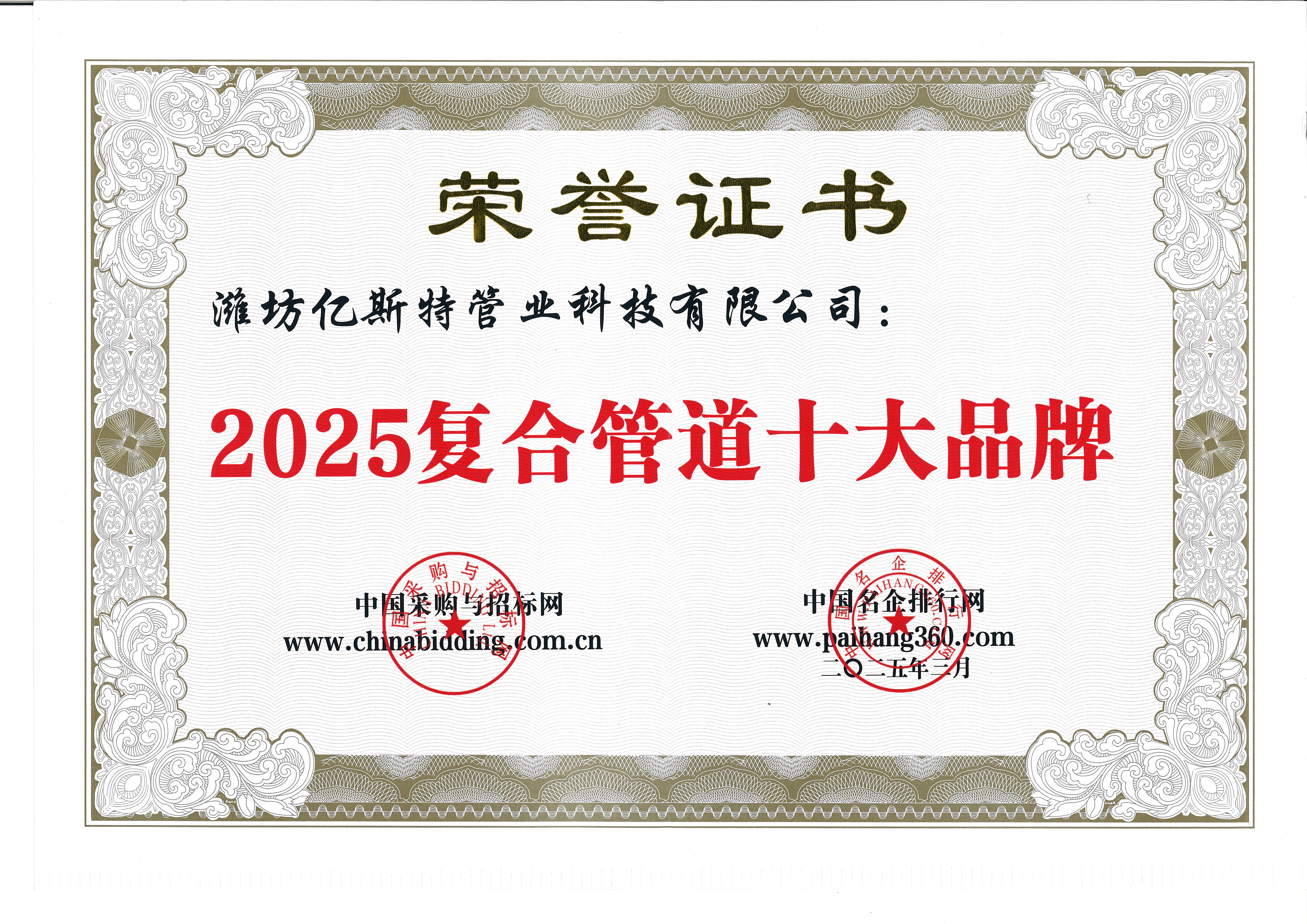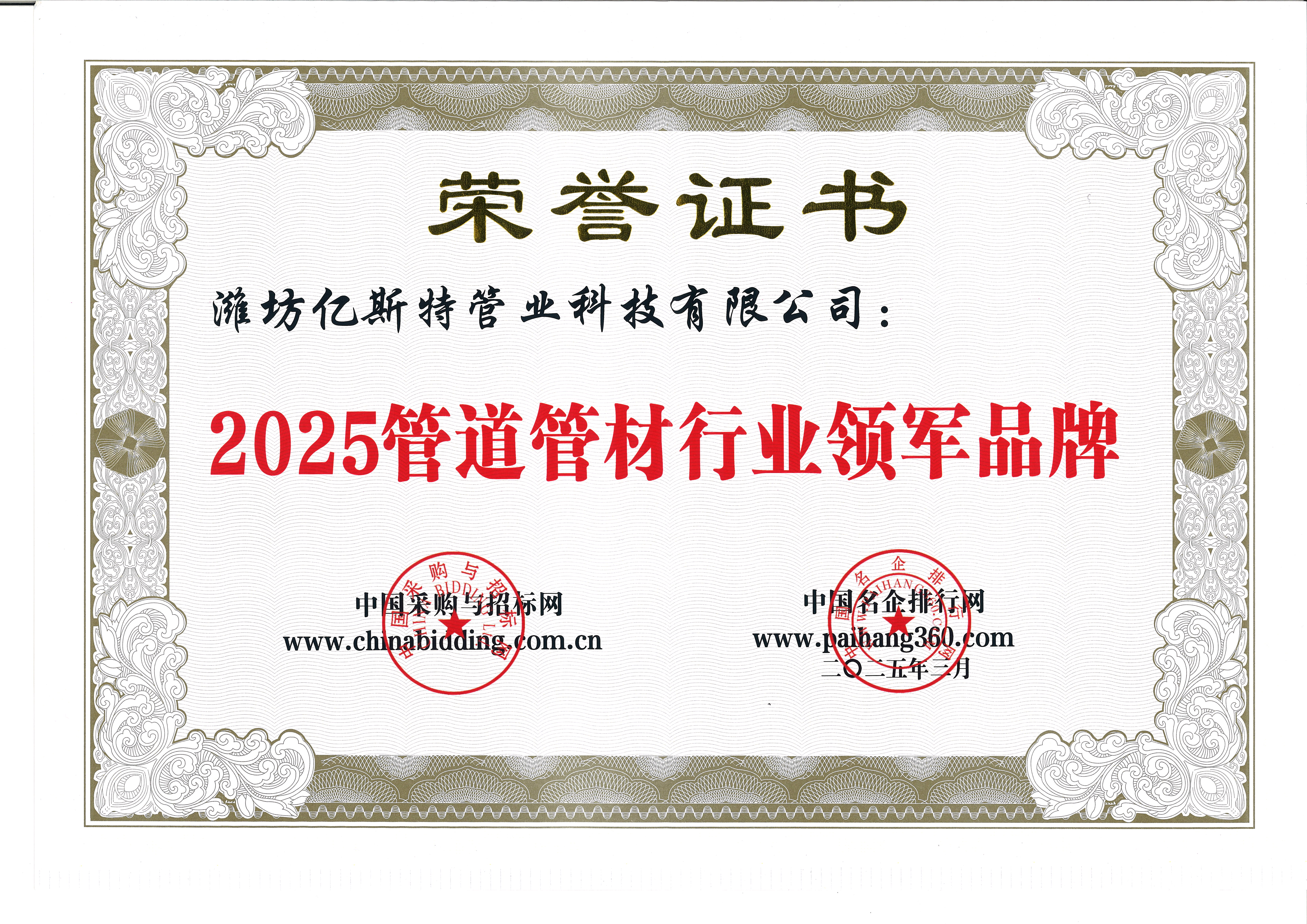 近日,在2025年17屆管道管材招標采購評價(jià)推介活動(dòng)上,濰坊億斯特管業(yè)科技有限公司憑借卓越的產(chǎn)品質(zhì)量、創(chuàng )新的技術(shù)研發(fā)及廣泛的市場(chǎng)認可,一舉斬獲“2025管道管材行業(yè)領(lǐng)軍品牌”、“2025復合管道十大品牌”、“2025管道管材十大質(zhì)量標桿企業(yè)”、“2025水利工程管材十大品牌”、“2025管道管材行業(yè)競爭力企業(yè)百強”五項殊榮,成為本年度行業(yè)內唯一同時(shí)獲得五項榮譽(yù)的企業(yè),進(jìn)一步鞏固了其在管道領(lǐng)域的龍頭地位。